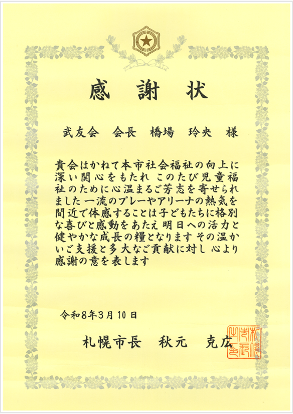 武友会が札幌市より感謝状を頂きました